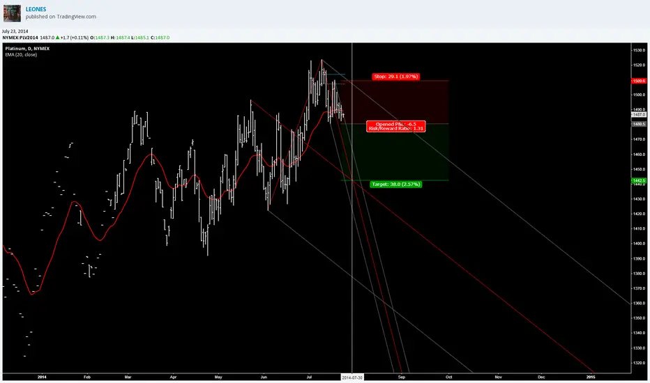 I'm short term bearish platinum (PLV2014). Short position below the recent pivot low targeting the median line. Hold max one week. Risk/Reward not the best but acceptable.