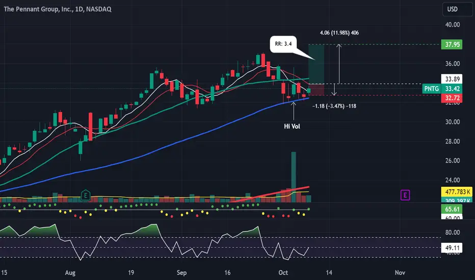 PNTG, I have a green setup signal(dot Indictor). It has an excellent risk-to-reward ratio. I'm looking to enter long near the close of the day if the stock can manage to CLOSE above the last candle highs(white line). If triggered, I will then place a stop-loss below(red line) and a price target above it(green line).