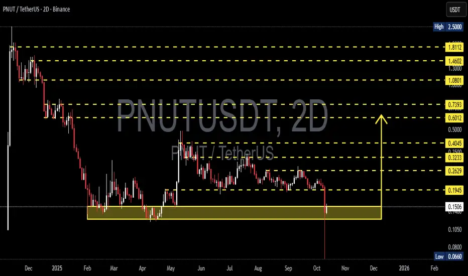 The PNUT/USDT (2D) chart is entering a critical phase after a long downtrend followed by a retest of a strong demand zone (yellow box). Current price stands at 0.1503 USDT, after forming an extreme wick down to 0.0660, then pulling back strongly — a clear sign of aggressive buyer reaction (liquidity sweep) from the same demand area seen in March–May earlier this year.