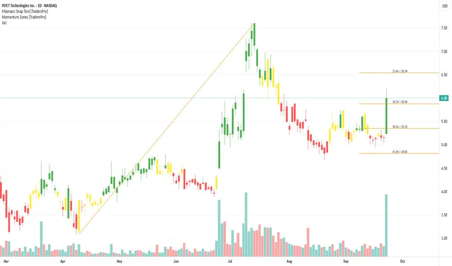 On the chart, a confirmation bar with rising volume highlights bullish momentum. The price has exited the corrective zone, moving off the .618 level and working toward the momentum zone above the .236 Fibonacci level. A trailing stop can be placed just below this Fibonacci mark using the Fibonacci snap tool, helping traders protect gains while leaving room for further upside potential.