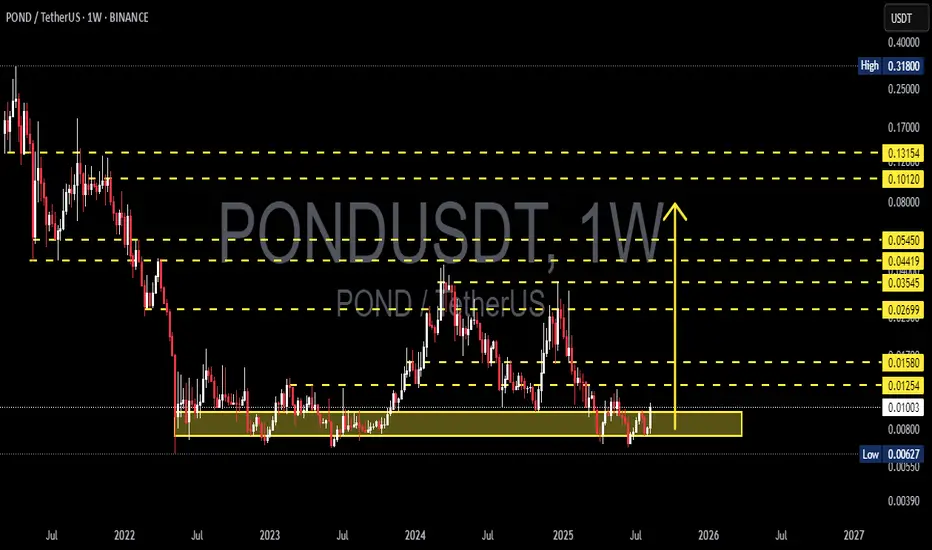 The PONDUSDT (1W, Binance) chart shows a long-term accumulation phase since 2022. Price has repeatedly bounced from the strong demand zone at 0.008–0.011, with the historical low marked at 0.00627. This zone acts as a “last line of defense” for buyers.