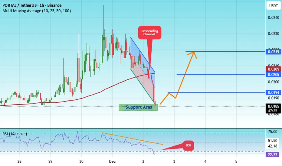 The price is moving in a descending channel on the 1-hour timeframe. It has reached the lower boundary and is heading towards breaking above it, with a retest of the upper boundary expected.