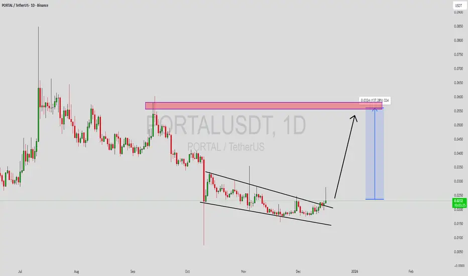PORTALUSDT is forming a clear falling wedge pattern, a classic bullish reversal signal that often indicates an upcoming breakout. The price has been consolidating within a narrowing range, suggesting that selling pressure is weakening while buyers are beginning to regain control. With consistent volume confirming accumulation at lower levels, the setup hints at a potential bullish breakout soon. The projected move could lead to an impressive gain of around 90% to 100% once the price breaks above the wedge resistance.
