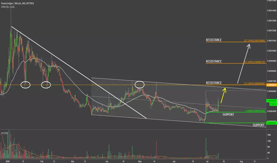 PowerLedger still trading within the descending channel, where prevailing trend is obviously down. On the 28th of June POWR/BTC found the bottom at 2847 satoshis, after which, under an increased heavy volume price went up to 6030 satoshis, breaking above the 50 Moving Average.