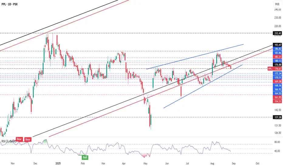 Buy when RSI > 50 and it starts to move upwards after touching the lower edge of Daily channel (blue)