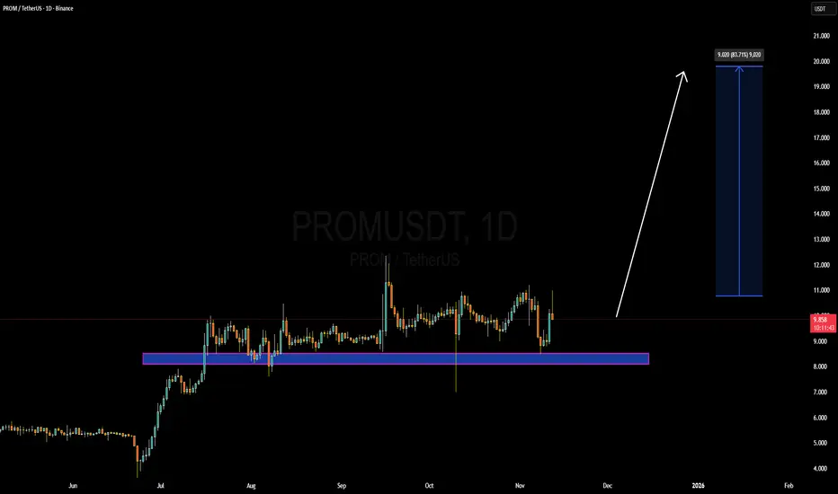 PROM/USDT is currently forming what looks like a consolidation base after a prior downtrend, indicating that accumulation may be underway and a bullish reversal could be on the horizon. The token’s price has held firm around the $9-$10 range while trading volume shows improvement, suggesting that institutional interest and market participation may be increasing. This kind of scenario often sets the stage for a breakout when both price structure and volume align.