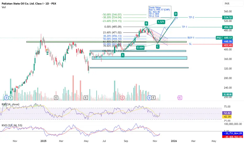 On daily TF, PSO has retraced to Fib 62% and then went up after staying there for a few days. Closing of a Green Candle with volumes indicates that Buyers are active now. Also noted that KVO trigger line (Blue) has just crossed over the Signal line (red) indicating interest of Buyers although it is yet below zero level but its direction seems quite vertical. Also RSI is also moving up very sharply and still it has room to move up quote a bit. AB=CD pattern has been drawn to arrive to the TP.
