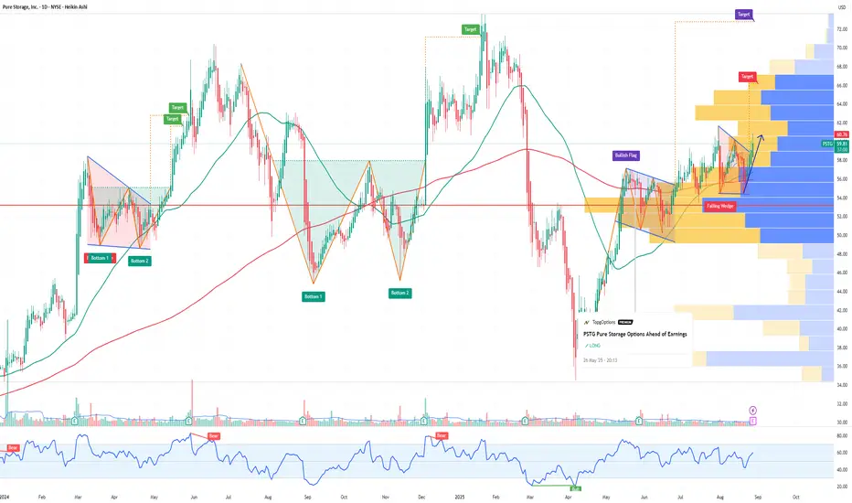 Now analyzing the options chain and the chart patterns of PSTG Pure Storage prior to the earnings report this week,
