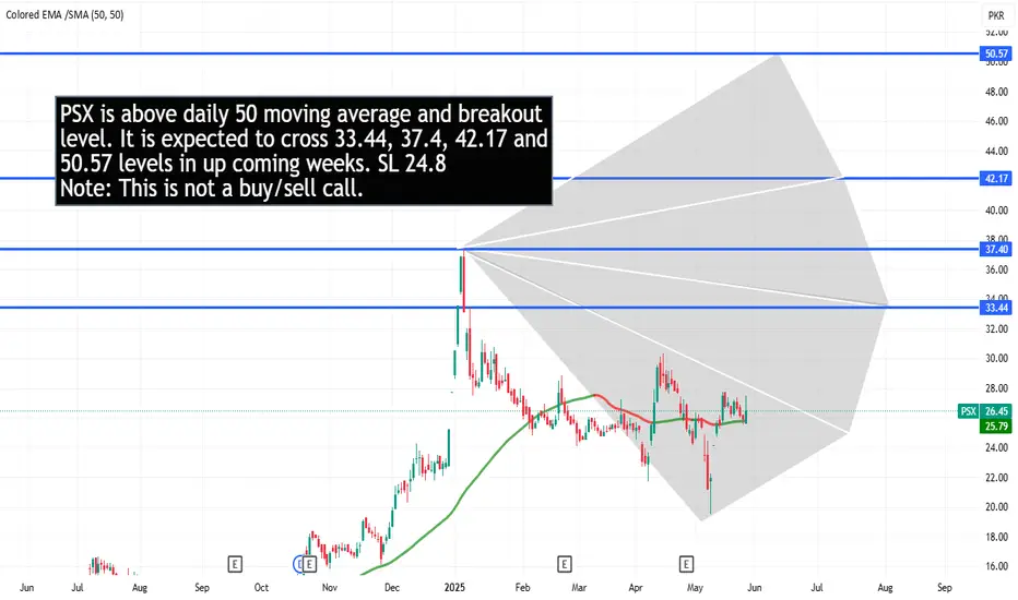 PSX is above daily 50 moving average and breakout level. It is expected to cross 33.44, 37.4, 42.17 and 50.57 levels in up coming weeks. SL 24.8