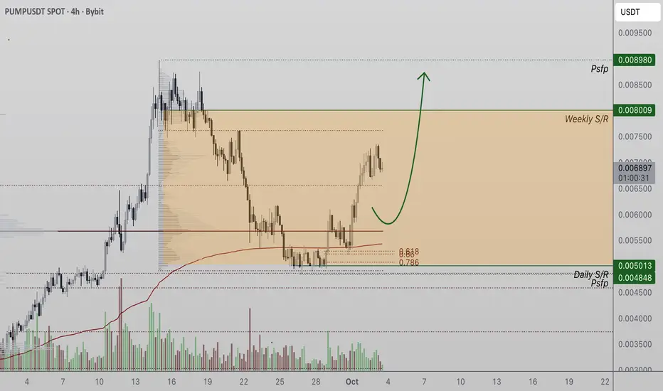 The recent price action on PumpToken demonstrates the strength of technical confluence zones in guiding market direction. After testing a cluster of supports, including a golden-ratio Fibonacci retracement and VWAP reinforcement, PumpToken reacted decisively to the upside. The move pushed price into a higher-timeframe weekly resistance, setting the stage for a potential macro continuation. However, the market is now in a period of consolidation that could either evolve into a breakout or a corrective structure before resumption of the trend.