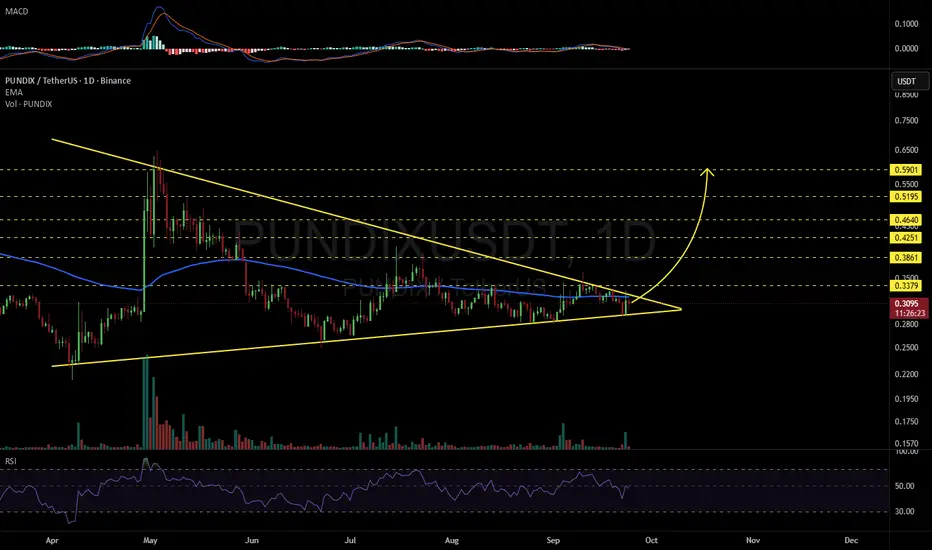 #PUNDIX is moving inside a symmetrical triangle pattern on the daily chart. Enter this coin after a clean breakout above the triangle resistance and the daily EMA100. In this case, the potential targets are: