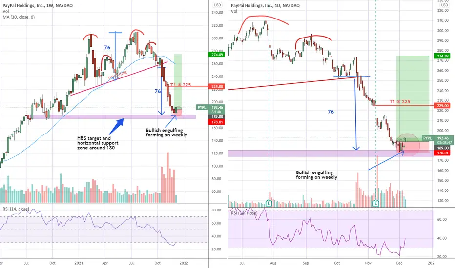 With a confluence of factors (H&S target, horizontal suppport and potentially bullish engulfing on weekly), I am fairly optimistic that it could have bottomed out.