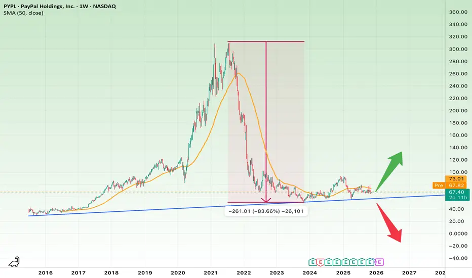 PayPal has corrected massively from its 2021 high ($310) to around $66, sitting exactly on a multi-year ascending trendline that has held since 2016.