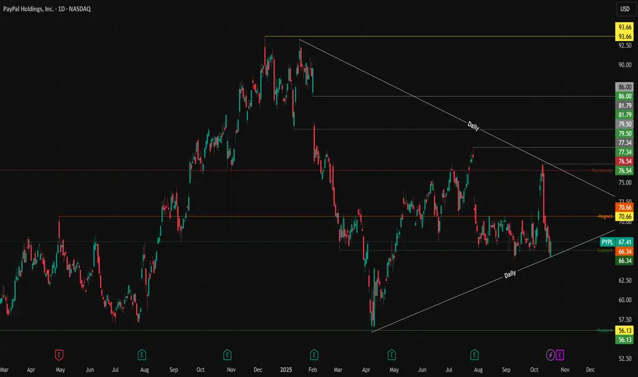PYPL is forming a large symmetrical triangle, tightening range between $65.70 support and $70.66 resistance (magnet zone).
