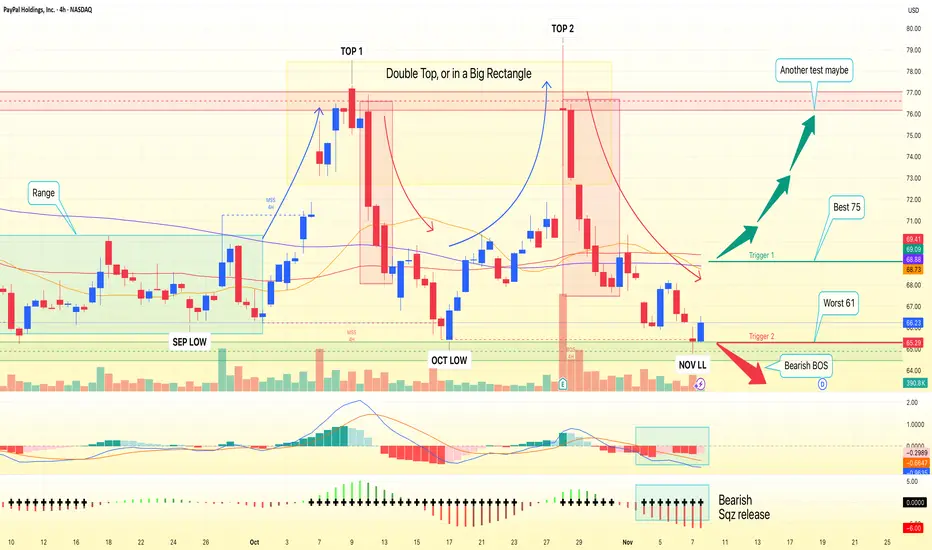 PYPL on the 1D chart remains a textbook rectangle, coiling after months of sideways trade. Price is back at the lower boundary near $65.50 with short-term momentum tilted bearish and all key MAs overhead. The MA20/60/120 are tightly clustered around $68.57–$70.63, reinforcing a heavy supply band. Volatility has contracted after October’s spike, so a decisive move from this squeeze looks close.