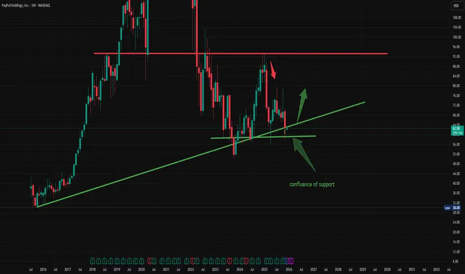 we have been ranging for 3 years now and every time we test green support we see a bounce off the trend line.from the old high we came down 35% and now all we need is conformation on the smaller time <but i believe the bottom is in .we also have a confluence of support that give us a high probability that we will see a reversal.
