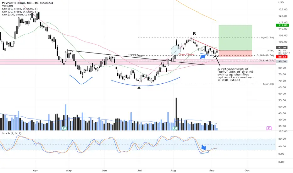 PYPL broke out of an Adam & Eve formation on 27 Jul, then gapped up strongly upon Earnings on 3 Aug. Since then, it has retraced about 38% of it's AB swing up and appear to find support @ 90 where the gap is closed.