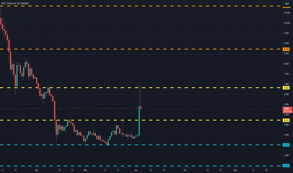 PYRUSDT(Vulcan Forged) Daily timeframe range. reached 6.823 twice before head back to retrace. local retrace point is at 5.222 and it needs to stay above that to reach 6.823 again. i had one position from 4.013 played out nicely.