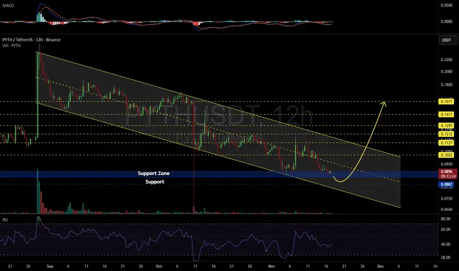 #PYTH is moving inside a descending channel on the 12H timeframe. It is currently sitting on the support zone. Consider buying a small bag here and another near the $0.0807 support level in case of a deeper dip.