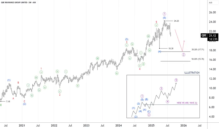 Key Points: Wave 1))-purple ended at the high of 24.20, wave 2))-purple is unfolding towards 17.38 - 17.50. So there is no convincing evidence of a developing Bullish trend, instead it shows a downward move of the market.
