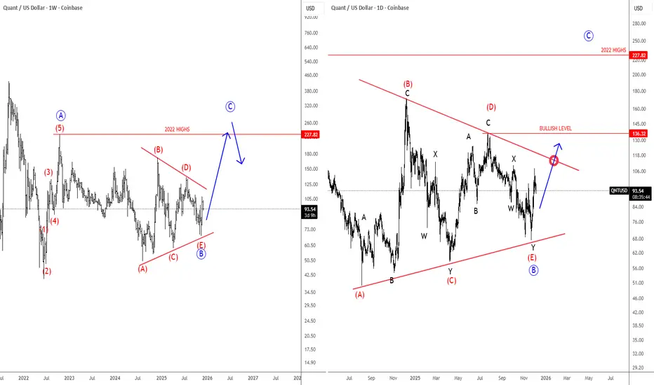 Quant with ticker QNTUSD is still holding up well above the lower triangle line, so bulls are still here. On the weekly basis, we can now see it finishing a bullish triangle pattern in wave B before we may see another rally for wave C. On a daily chart, it may actually have a completed complex W-X-Y decline within final wave (E) of B, but bullish confirmation for wave C is only above the upper triangle line and 136 level.