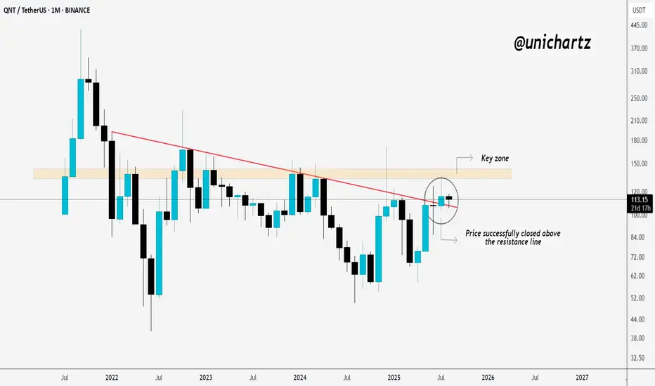 QNT is looking strong. Price recently broke and closed above the long-term resistance trendline and is now sitting just below a key resistance zone.