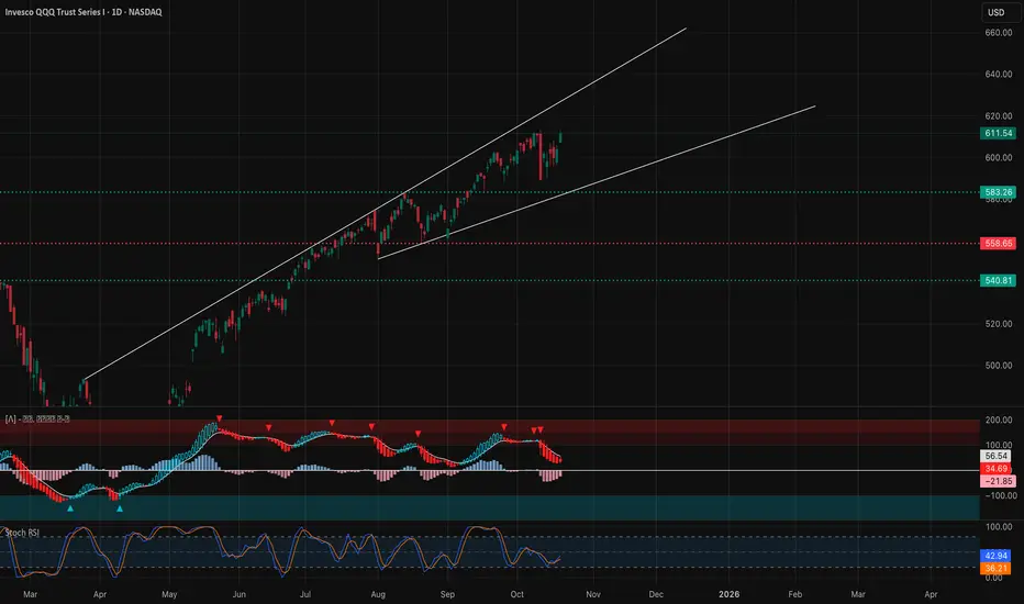 Currently, QQQ is consolidating beneath the $612โ$616 resistance wall. A clean breakout with volume could trigger a test of the upper trendline near $620.