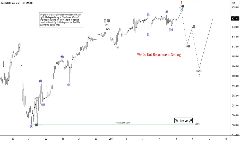The short-term Elliott Wave outlook for the Nasdaq 100 ETF (QQQ) indicates that the cycle from the April 2025 low remains active. Wave (4) of the ongoing impulse concluded at 580.27, and the ETF has since resumed its upward trajectory. To confirm continuation, price must break above the prior wave (3) peak recorded on 30 October at 638.41. The rally from the 21 November wave (4) low has matured and is expected to complete soon, reflecting the natural rhythm of the Elliott Wave sequence.