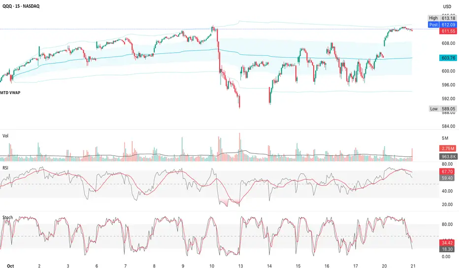 - MTD VWAP ≈ $603.7, with +1σ ≈ $611 & +2σ ≈ $613