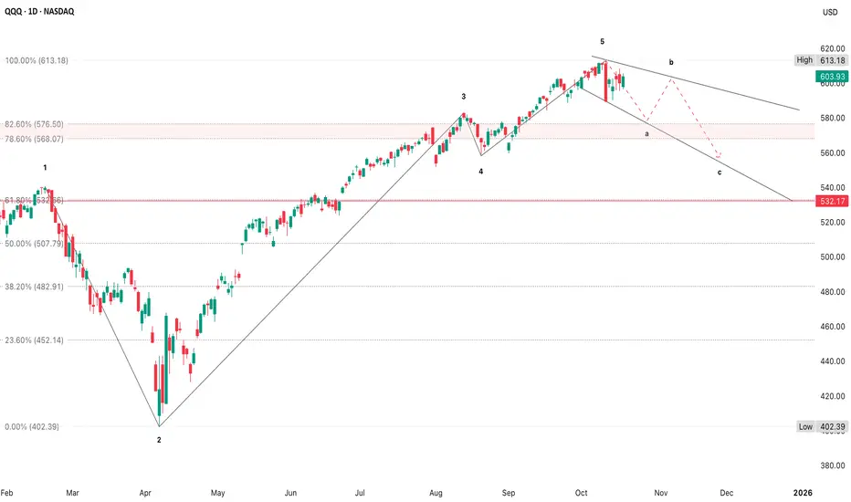 - If that rhythm repeats, the current topping area around $613 could imply a pullback to $560-$580