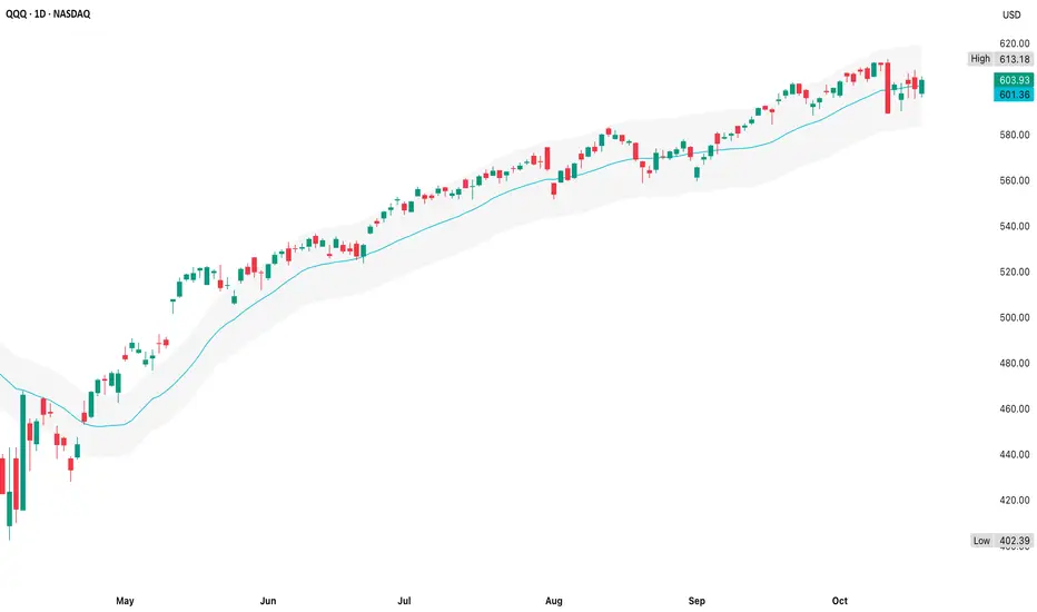 The daily chart shows QQQ trapped around its mean, with weakening upside participation - ideal environment for short-term bearish option plays (1-3 week window), but not yet a crash setup