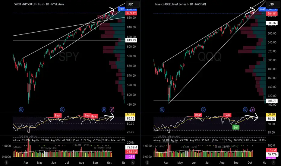 SPY and QQQ daily charts showing price near highs while RSI makes lower highs, volume below average