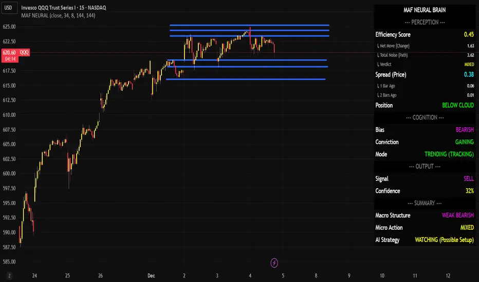Trader's Takeaway: Do not short aggressively yet. The "Neural Brain" is telling you that while the structure is bearish (Price < Cloud) and conviction is building, the current moment lacks the momentum or clarity for a high-confidence trade.