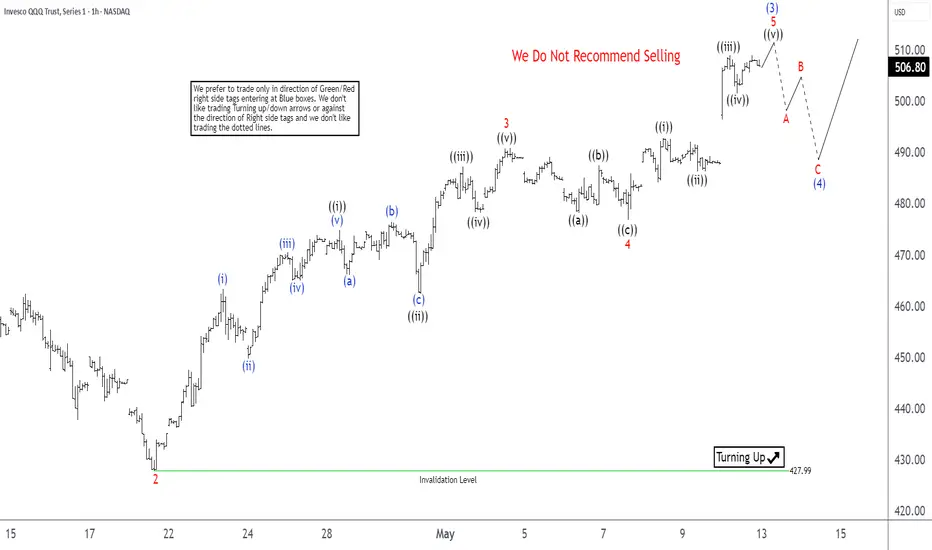 Near term, the ETF is expected to complete wave 5, which should also conclude wave (3) of the larger structure. Following this, a corrective wave (4) is likely to retrace part of the rally from the April 9 low before the ETF resumes higher. As long as the pivot at $428 holds, any dips should find support in a 3, 7, or 11-swing pattern, supporting further upside. This analysis points to a bullish outlook for the QQQ, with potential for continued gains in the near term.
