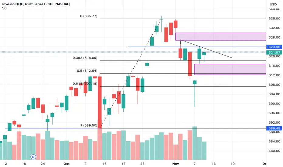 Important to be patient as the QQQs try to chop buyers and sellers in a range before breaking out or breaking down. I'm looking at playing the gaps, buying puts if we fill the upper range gap (with tight stops), or adding longs if we fill the lower range gap first. The lower range gap also has confluence with an important Fib level, giving strong conviction to go long, and would be much healthier for this bull market trend.
