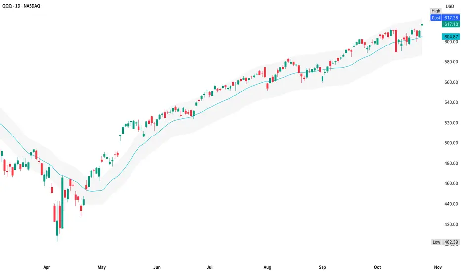 - Envelope width is about 36 points (~6%), normal for a trending QQQ environment