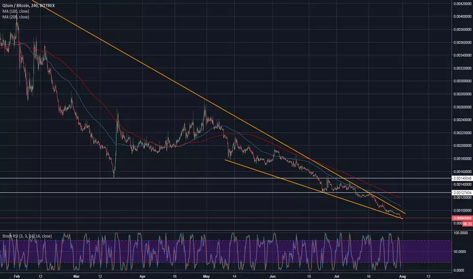 Seven months have passed since QTUM entered a downtrend on the higher timeframe. The series of lower highs and lower lows has created a falling wedge and trapped the price action within it. A falling wedge is a reversal pattern. As a reversal signal, it is formed at a bottom of a downtrend, indicating that an uptrend would come next. The price action stays trapped for a longer period of time within the wedge and a huge amount of energy is accumulated, waiting for the price to break out of the wedge and collect all stops. In addition, the RSI on the H4 chart is deeply oversold, which adds more weight to the potential bounce in the coming days. If the price breaks the wedge and starts rallying, look for a test of both 100 and 200 MAs on H4 chart as well as two horizontal resistance levels that acted as support in the past. The coin is so oversold that a potential reversal offers a great R:R for the traders. Any long position must be protected with a stop beneath the wedge support.
