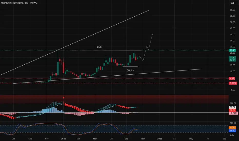 QUBT is showing one of the most constructive long-term setups in the small-cap quantum sector. The weekly chart confirms a Break of Structure (BOS) earlier this year, followed by a healthy consolidation between $18–22, forming a potential accumulation range before the next expansion.