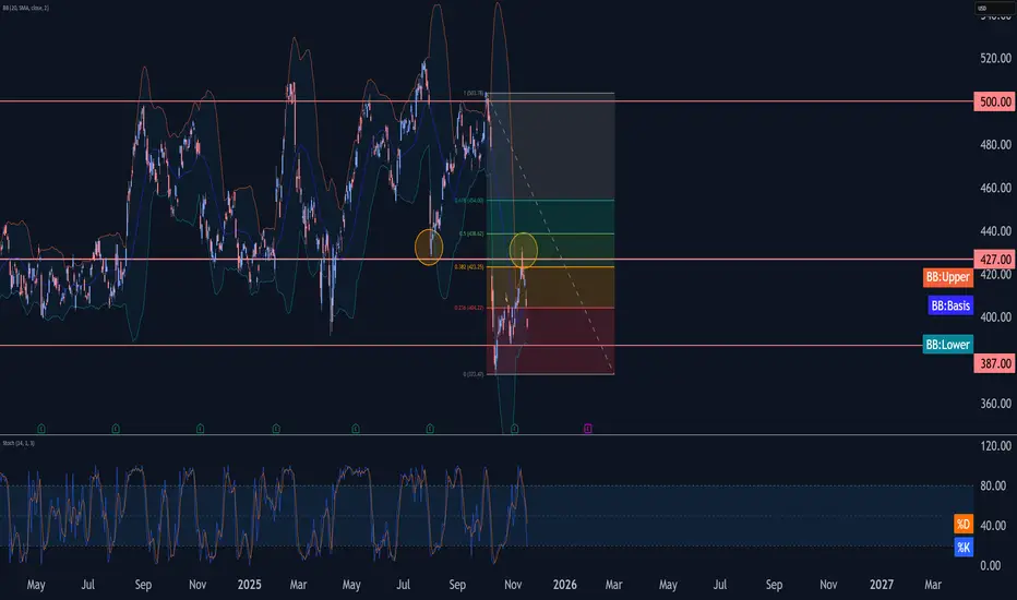 Ferrari recently reversed down from the resistance zone between the resistance level 427.00 (former monthly low from August), upper daily Bollinger Band and the 38.2% Fibonacci correction of the downward impulse c from October.