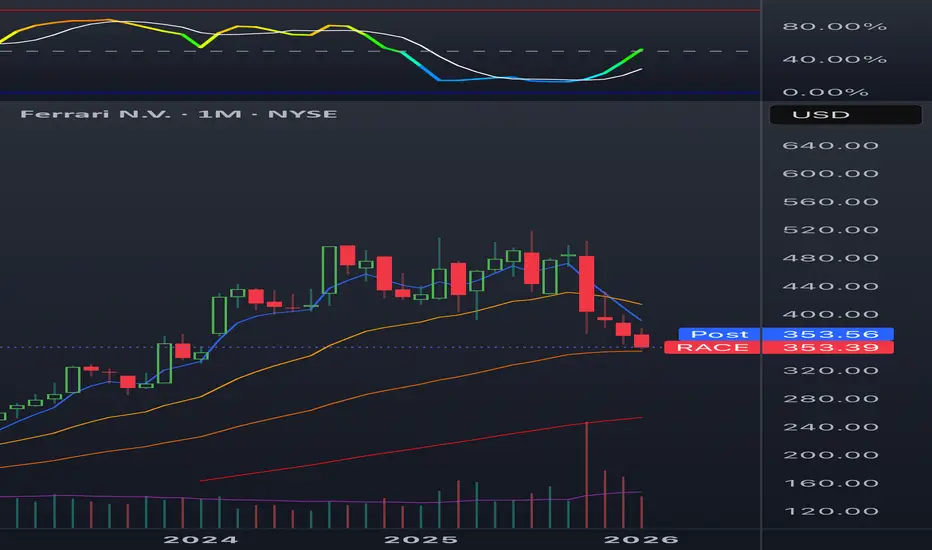 Race is an amazing market fear and recession stock testing the 55 month ema. We note a macro monthly demand zone in the same region. A 40% upside is apparent. I am net long here