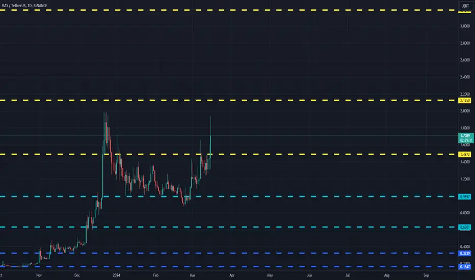 RAYUSDT (Raydium) Daily timeframe range. if we zoomout and look closely this thing got lots of room for to surf. but the question is in what duration. for now 2.1250 yet to reach but staying above 1.4872 will make sure of it.