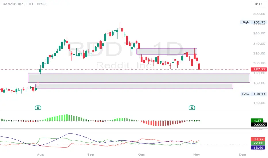 RDDT - Stock moving lower post earnings breaking below $190 support level. Stock has 2 gaps to fill to the downside. puts below $185 looking good for a move towards $177.50 for a gap fill to $161 and $150. Stock is weak at the indicator level.