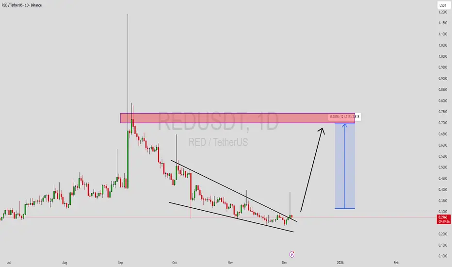 REDUSDT is forming a clear falling wedge pattern, a classic bullish reversal signal that often indicates an upcoming breakout. The price has been consolidating within a narrowing range, suggesting that selling pressure is weakening while buyers are beginning to regain control. With consistent volume confirming accumulation at lower levels, the setup hints at a potential bullish breakout soon. The projected move could lead to an impressive gain of around 90% to 100% once the price breaks above the wedge resistance.