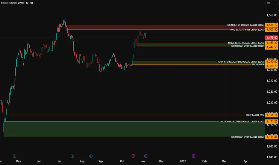RIL is at a critical juncture. Traders should closely monitor how the price reacts to these identified supply and demand zones. The levels of 1,524.70 on the upside and 1,447.50 (short-term) / 1,360.00 (medium-term) on the downside will be pivotal in determining its near to medium-term trajectory.