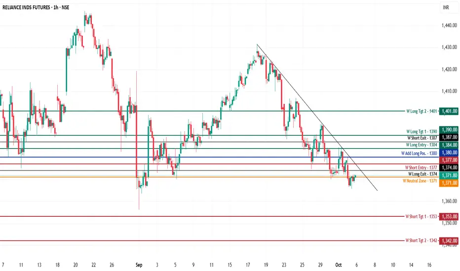 Reliance is currently trading near 1,371.80, trying to lift above a descending trendline after an extended correction phase. The price action is testing a critical neutral zone near 1,371, which will dictate the weekly bias.