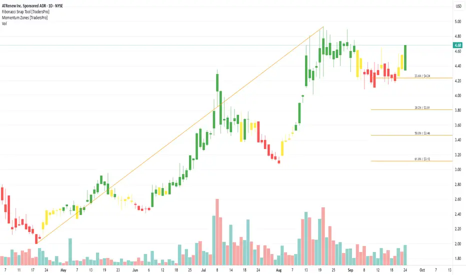 On the chart, a confirmation bar with rising volume highlights bullish momentum. The price has entered the momentum zone after climbing above the .236 Fibonacci level. A trailing stop can be placed just below this Fibonacci line using the Fibonacci snap tool, helping traders secure profits while leaving room for further upside potential.