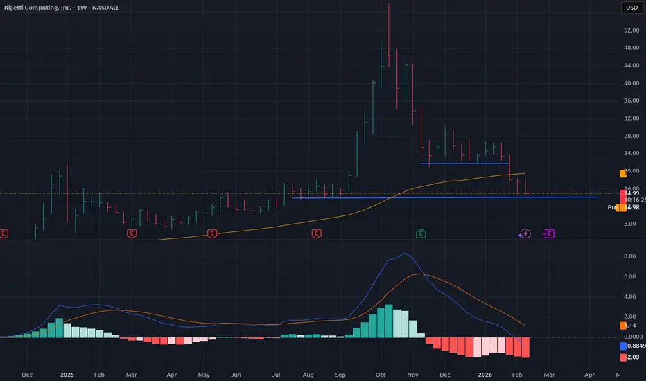 As of this week Rigetti has failed in uptrend continuation, there's still trend strength but it continues to weaken. It may take much longer for RGTI to find the bottom. Watch for $14 level to hold the support and be cautious of further downtrend once broken.