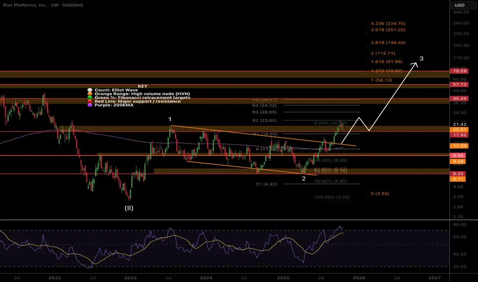Wav 2 completed at triple support- Fibonacci golden pocket, High Volume Node and channel boundary before quickly overcoming the weekly pivot and 200EMA. Breaking out above wave 1 is a show of strength,