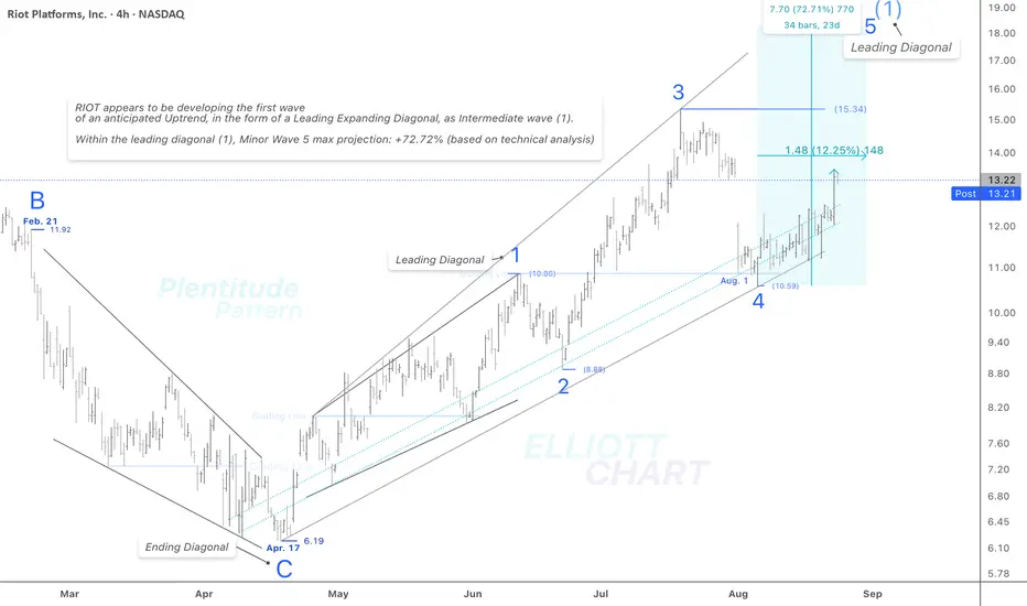 RIOT surged 12% intraday in an impulsive rise, closing with a 7.7% gain above the August consolidation zone — further reinforcing the outlook for continued upside in Minor Wave 5 of the leading diagonal, unfolding as the final advance of Intermediate Wave (1).