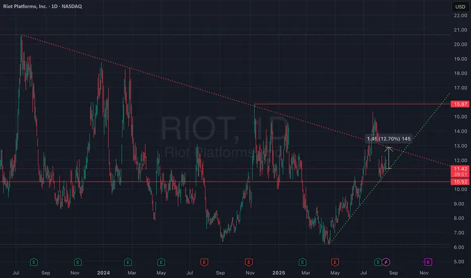 RIOT is grinding higher from its $6.19 June low and is now pressing against a long-term downtrend line near $13. A clean breakout above $13.09 could open the way to $15.34 and the key $15.87 resistance. Support sits at $11.44, with the rising trendline keeping bulls in control. Watching for a volume surge to confirm the move.